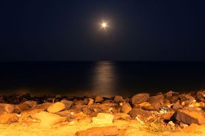 The gentle splashing sound of the waves gradually hit a crescendo as they lashed out with all their might against the rocks – from a baby’s feeble laughter to an opera singer’s majestic high, and then back again. I found myself totally giving in all my senses to this tryst with nature. As I traced the waves to their origin, all I could see was the soft moonlight glistening on the swaying water and the lonely lights of a few distant ships far, far away. As I continued to gaze at the sea, it seemed to be drawing me into some kind of a trance. I kept looking at it for a while before I reluctantly turned away to look at the source of light itself – the brilliant full moon, glowing in all its grandeur. The eerie clouds, looming all over, looked oddly spooky in this setting; they could almost be the spirits of all the dead people, for all. But they just had to be there to complete the most picture-perfect canvas. I marvelled for the first time in my life, how intensely bright the sun’s light had to be, to be reflected back from the moon. I tried drawing a picture of how far the moon would be. But it was an exercise in futility – I was only left to wonder.